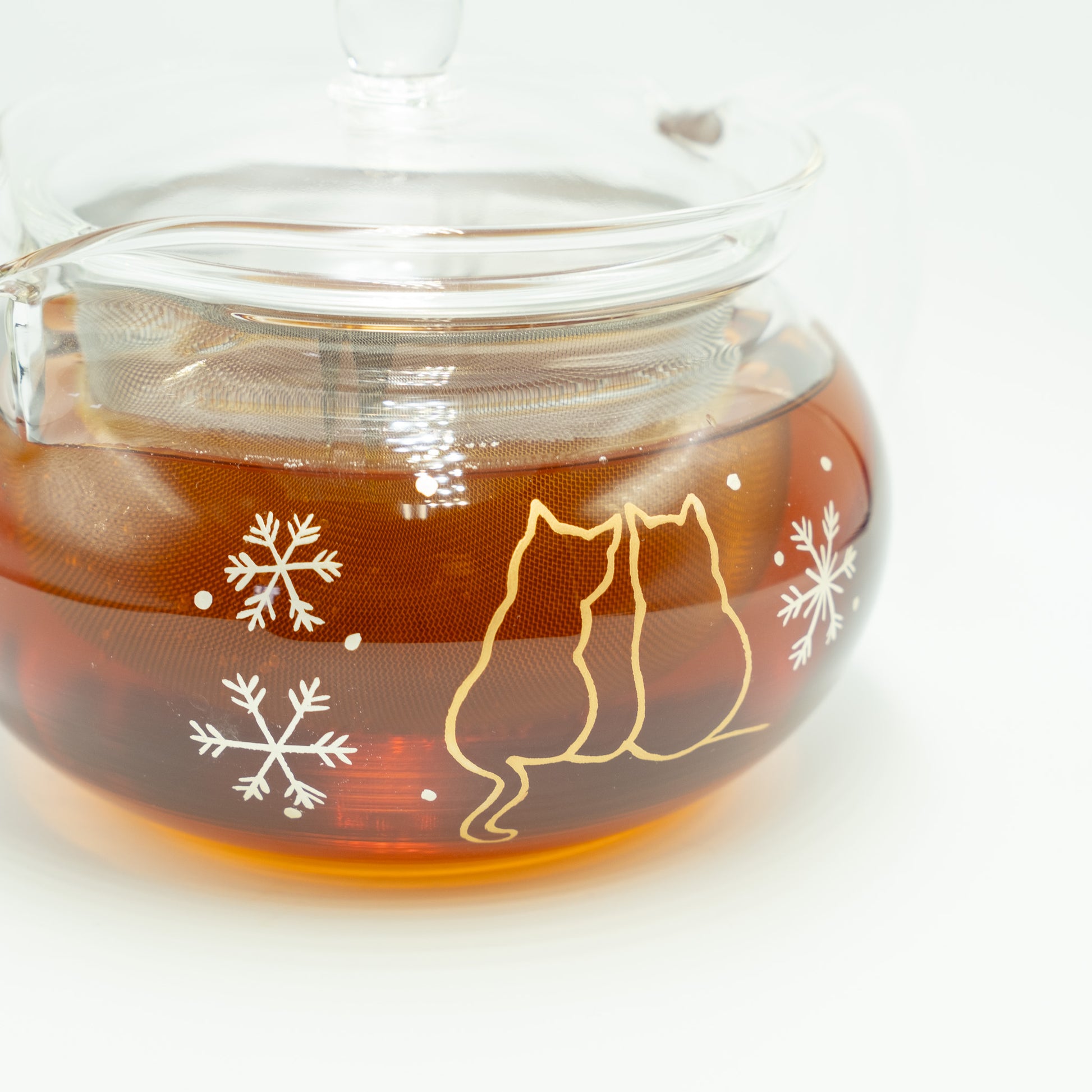 透きとおる耐熱ガラスのティーポットに、寄り添う猫を金の蒔絵で描き、そのまわりに銀の雪の結晶をあしらいました。